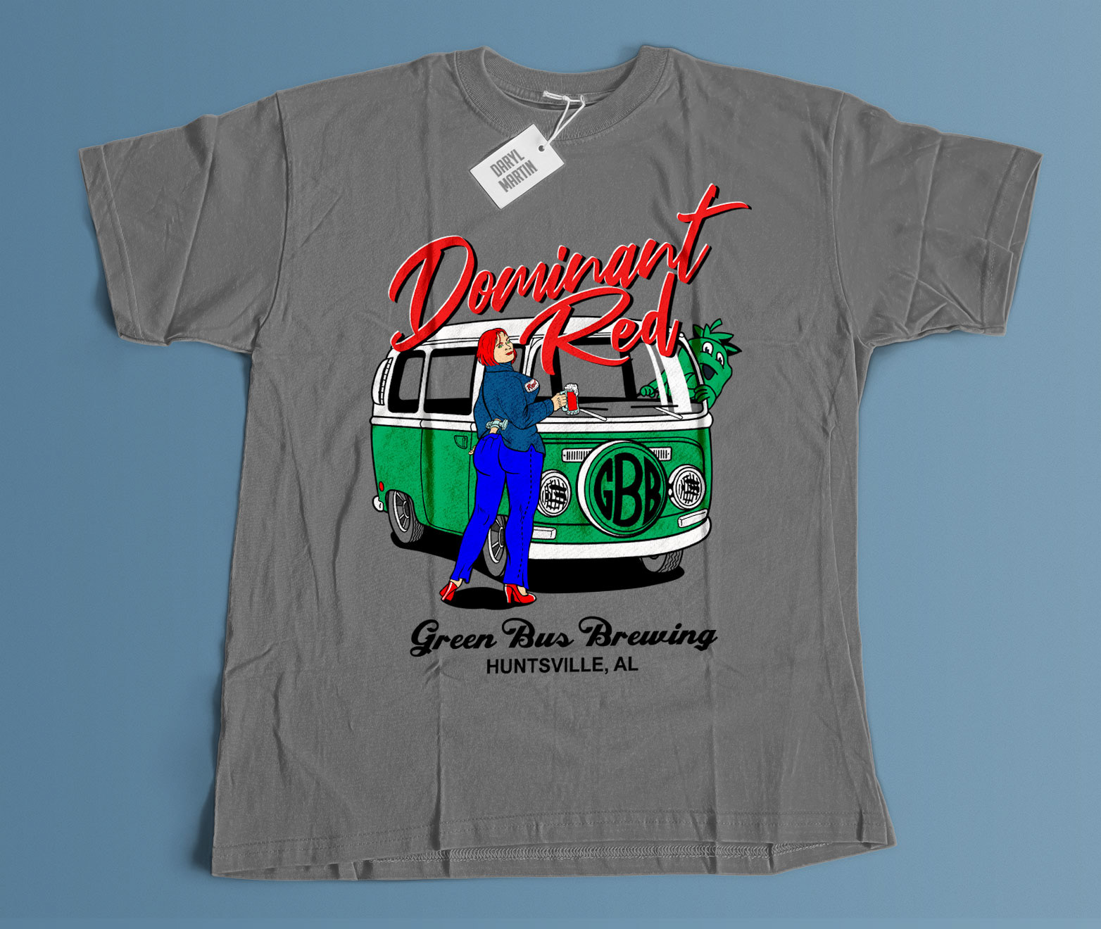 T-shirt for the launch of "Dominant Red" brew at Green Bus Brewing