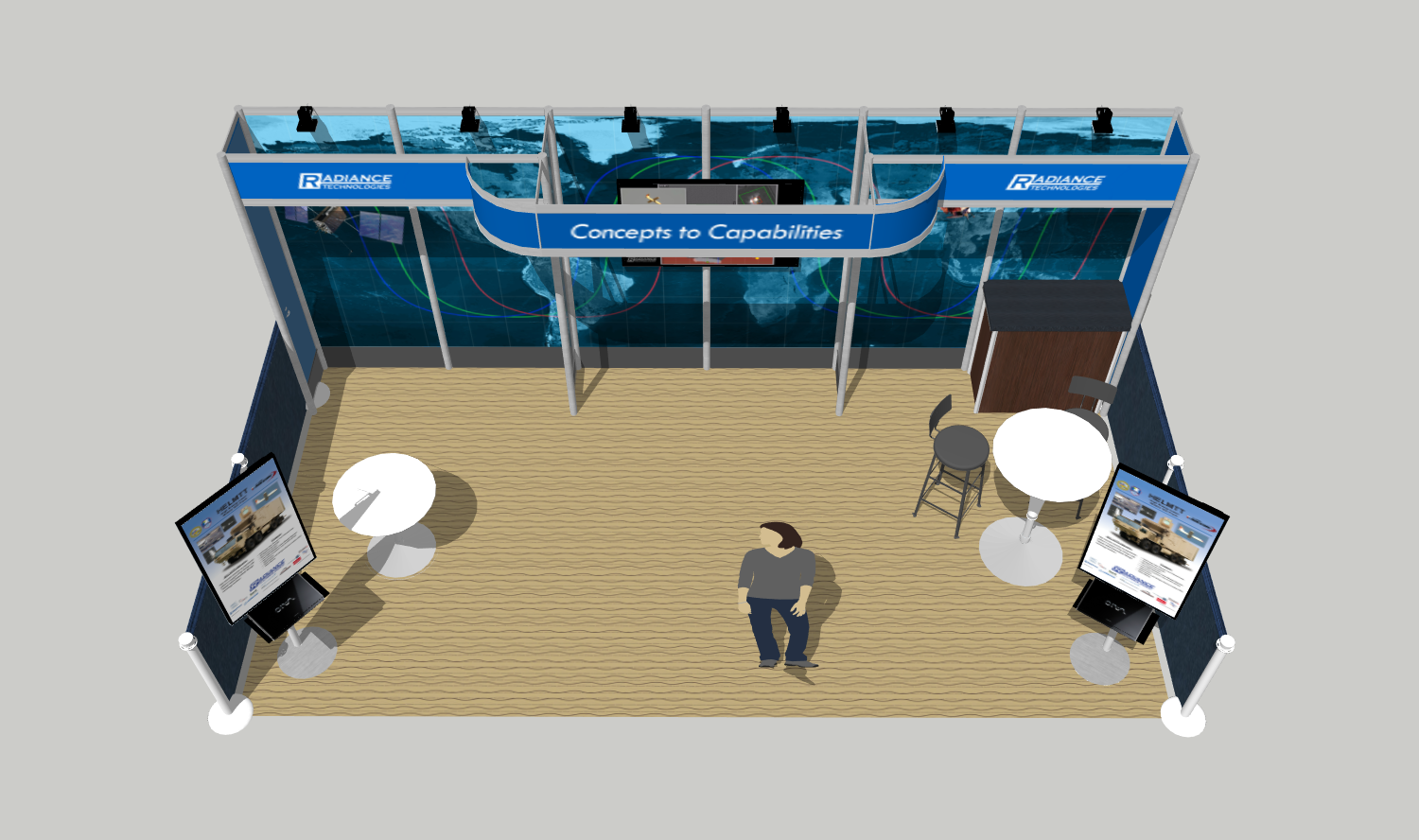 This is a 3D model I made in SketchUp of a trade show booth. Textures were created in Adobe Illustrator and Photoshop. Tables and chairs were found and imported from the SketchUp Warehouse.